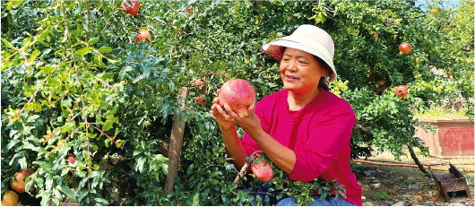 与朱村相隔8公里的逍遥村,村民曹佃国的石榴园里的石榴也挂满枝头。曹佃国种植了270亩石榴,据介绍,种植前三年,政府每亩奖补800元土地租金、300元管理成本。此外,他家的270亩石榴种苗都由政府免费提供。