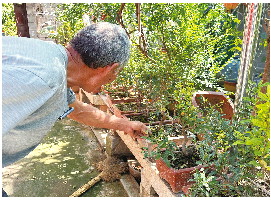 刘威向记者介绍,之所以称“生童子功”,是选用石榴树上不结果的枝苗,到冬天的时候扦插,从小用定型丝根据不同造型进行树体缠绕拿弯,再上盆细做。与其他做石榴盆景园子不同的是,刘威在种植销售石榴盆景的同时,还为老年农户寻找到一条适合长远发展的致富之路。