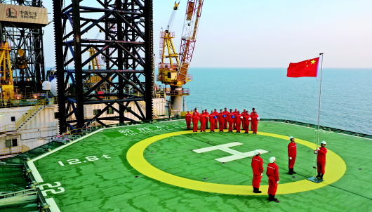 10月1日,在渤海湾新北油田,迎着清晨第一缕阳光,伴随着雄壮激昂的国歌,胜利石油工程公司海洋钻井公司新胜利三号平台上升起了鲜艳的五星红旗。全体员工肃穆而立,祝福伟大祖国繁荣昌盛。 通讯员 仝瑞斌 摄