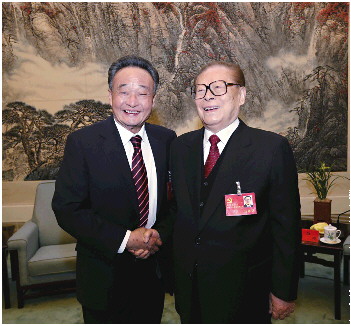 2005年1月1日,全国政协在北京举行新年茶话会。这是胡锦涛同志与吴邦国同志在一起。 图片据新华社