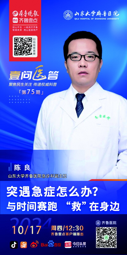 人们常说“时间就是生命”,在实施医疗救治过程中,这句话更是能够引起医生与家属的共鸣。相比起有轨迹可循的慢性疾病,突发的急症往往更容易让人手足无措。因此,了解急症识别及处置等相关知识尤为重要。10月17日,山东大学齐鲁医院急诊科副主任陈良做客“壹问医答”直播间,围绕心脏或呼吸骤停的应对方法、AED(自动体外除颤器)的功能与使用、海姆立克手法教学、一氧化碳中毒后的急救措施、健康生活习惯提醒等内容,开展常见急症识别的专题讲座,敬请关注。