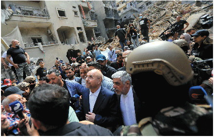 ◥10月12日,伊朗议长加利巴夫(中左)到访黎巴嫩贝鲁特市中心最近遭以色列空袭的地点。