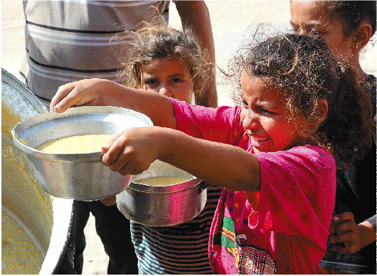10月16日,在加沙地带南部汗尤尼斯,人们领取救济食物。 新华/路透