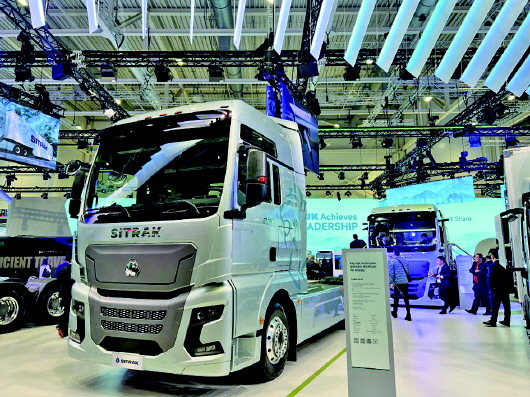 ▲中国重汽携带全新升级的黄河氢内燃机牵引列车、汕德卡氢燃料电池牵引车、HOWO统帅纯电轻卡等共计7款车型亮相德国汉诺威车展。