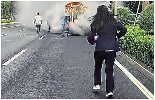 车载监控显示,10月17日9时53分,公交K267路女驾驶员张晓驾车运行至贤文花园南区附近路段时,发现车正前方有一辆工程车自燃起火,随着火势蔓延,现场冒出滚滚浓烟,情况比较危险。张晓立即将车停靠在安全位置,在和乘客做好解释后,拿起车厢前部的灭火器下车。