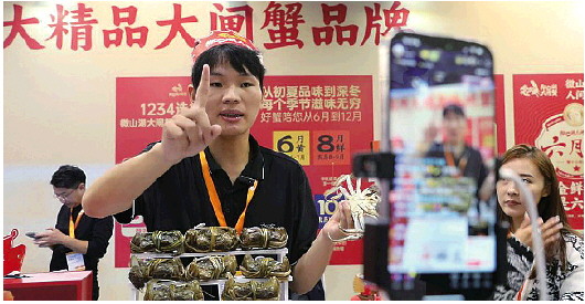 展会现场,一位养殖户通过直播售卖微山湖大闸蟹。