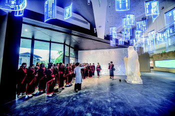 “孔子弟子中擅长做生意的是谁?”“子贡!”10月26日,在曲阜市尼山镇夫子洞村“探源尼山 斯文在兹”文化主题展馆内开展的“走进孔子”研学之旅活动现场,屏幕上一道道关于传统文化的趣味问答引得游客们争相竞答,氛围高涨。“孩子们在这里不仅能聆听千古颂传的人文故事,更能在体验中感受先贤智慧。”来自甘肃的游客杜小龙说。