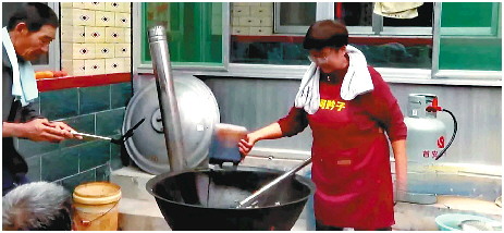 近日,在龙桑寺镇道口张村,王秀珍正为一户办喜事的人家制作用来招待乡里乡亲的“大锅菜”。油锅热气腾腾,辣椒、大料等入锅煸香,大块的五花肉下锅翻炒,随后慢慢浇入酱油,肉色变得金黄亮丽,经过炖煮,再倒入白菜、粉条、豆腐慢炖。