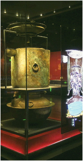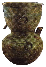 上海博物馆珍藏的一件东汉初至中期青铜蒸馏器,由甑和釜两部分组成,通高53.9厘米,凝露室容积7500毫升,贮料室容积1900毫升,釜体下部可容水10500毫升。两者以子母口对接,甑上有聚集蒸馏液的排流管,釜上有加注蒸馏液料的小管。下部的釜经过加热后,蒸发的气体通过箅孔遇甑壁,就会冷凝成液体,从而流向槽道聚集起来,通过流孔,就可以流出甑外,汇聚而成为高酒度的烧酒。这件青铜蒸馏器,无论从器型结构还是使用原理上,都具备了现代蒸馏器的雏形,因此,也被多数学者公认为早期蒸馏器中最完好的青铜蒸馏器。上海博物馆原馆长马承源用这件蒸馏器做了多次蒸馏实验:以发酵的糯米酒醅为原料蒸馏获得20—27度酒;以51.1度的酒为原料蒸馏,得到79.4度的酒;用15.5度酒蒸馏得到42.5度酒。他认为此件蒸馏器既可以蒸馏酒,又可以蒸馏花露或者药物,说明公元1世纪中国已经有了青铜蒸馏器。