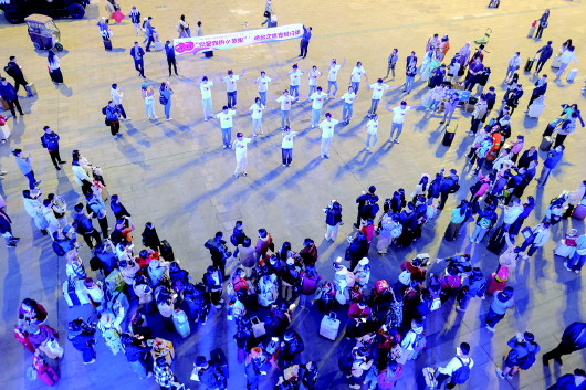 4月30日晚上,“你是我的小苹果”烟台文旅宠粉行动在烟台火车站广场举行,旅客出站迎来一段欢乐的舞蹈。 吕奇 摄