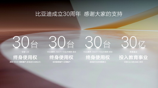 比亚迪如今的成绩,离不开社会各界的关注与支持。王传福以4个“30”回馈社会、车主和员工,真诚感谢一路同行的伙伴。