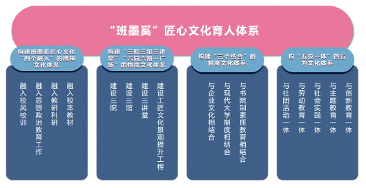 枣庄职业学院坚持立德树人,把打造“班墨奚匠心文化”作为人才培养的一个突破点,充分发挥枣庄作为中国工匠文化重要发祥地、工匠精神诞生地的文化品牌优势,深入挖掘鲁班、墨子、奚仲等枣庄古代工匠大师的历史文化资源和时代内涵,大力实施“工匠精神培育工程”,系统构建工匠精神培育体系,努力打造“班墨奚”匠心文化职教品牌。通过构建班墨奚匠心文化“四个融入”的精神文化体系;构建“四层递进”的物质文化体系;构建“三个结合”的制度文化体系;构建“五位一体”的行为文化体系等四个方面,创新文化育人思路,取得了优异的成绩。