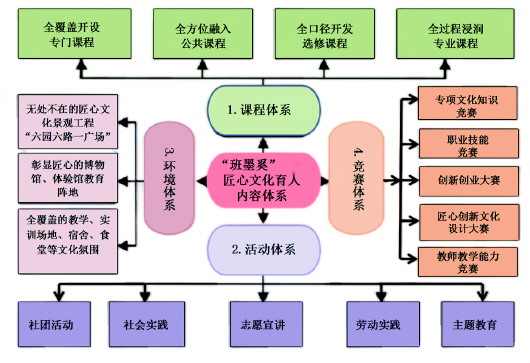 (四)构建“五位一体”的行为文化体系。与社团活动一体。将匠心文化引入学院社团活动,通过举办班墨奚工匠文化节、冠名社团活动,引领学生主动了解古今中外工匠事迹,探寻工匠精神,形成自我工匠理念认知,积极投身到工匠精神的阐释和传播活动中。与劳动教育一体。积极打造班墨奚匠心文化生存的丰厚土壤,弘扬“劳动光荣、技能宝贵、创造伟大”的时代风尚,营造人人皆可成才、人人尽展其才的良好环境,努力培养高素质“工匠型”技术技能人才,让每个学生都有出彩的人生。与社会实践一体。在社会服务中积极发扬“工匠精神”,通过顶岗实习、“三下乡”、志愿服务活动,让学生尽早接触社会,锻炼能力,增长才干。与主题宣讲一体。通过定期开展主题宣讲会、主题班会、专题讨论会等组织宣讲的形式,让学生了解工匠文化在个人成长及就业中的重要作用,唤起内在需求。充分利用新生入学、诚信考试、奖助学金评比、素质拓展等重要节点,加强班墨奚匠心文化教育,让学生获得分阶段的感受、体验和进步。与创新教育一体。建立奚仲创新工作室、鲁班工坊、墨子创客空间。