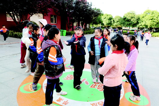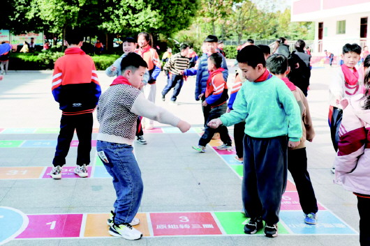 如今,每当课间铃声响起,学生们不再局限于教室的狭小空间,而是纷纷走出教室,奔向操场。在开阔的地面上,学校精心绘制的地面游戏图案仿佛为学生们打开了一个全新的世界。他们或跳跃、或奔跑、或嬉戏,欢声笑语充满了整个校园。