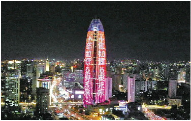 11月28日晚,济南地标性建筑绿地中心和经十东路沿线楼宇为庆祝齐鲁壹点十周年亮灯。