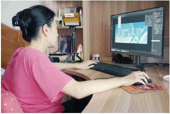 刘晓丽在用电脑为自己的小店做海报。(受访者供图)