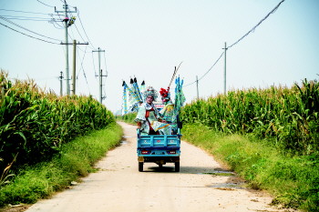 坐在三轮车上的演员从村里经过。