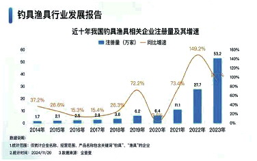 近年来,中国的钓具市场规模不断扩大。企查查显示,近十年,我国渔具相关企业注册量逐年增加,尤其是2021年开始,注册量进入快速攀升阶段。2021年我国渔具相关企业注册量首次突破10万家,全年注册量同比增加73.4%至11.1万家,次年相关企业注册量同比大幅增加149.2%至27.7万家,达近十年注册量增速峰值。