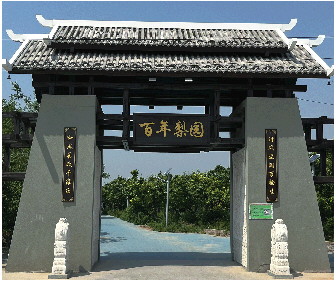 路边有一座被称为“仙女受梨”的雕塑,六位仙女每人手心托着一个鸭梨,其中站在中央高处的两位仙女,将鸭梨擎过头顶,从很远就可以看到。仙女雕像栩栩如生,又有那么好吃的鸭梨,来客欣喜自在情理之中。鸭梨之乡不仅有梨还有礼,人文之风扑面而来。继续前行,看见一座写有“百年梨园”的牌坊。