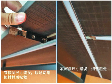 按照合同工期,王女士想着年底前新家肯定就焕然一新了,没想到装修期间问题不断:多处墙板的木纹匹配不上、工艺处理粗糙,定制的橱柜缝隙存在问题、各种尺寸有误差……最让王女士不能接受的是,家中二楼、三楼安装的衣帽间不仅有难闻的气味,而且做工特别粗糙。