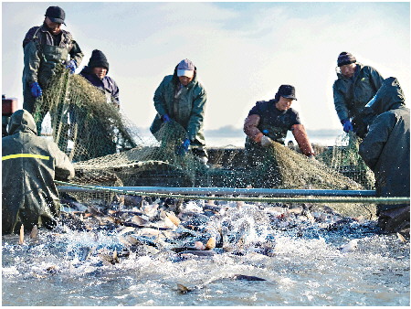 十几分钟后,网箱收紧聚拢至渔排边缘,数千条鲢鱼、草鱼顺着网箱捕舌,慢慢赶进渔排中。刹那间,平静的水面变得浪花飞溅,成百上千条鲜鱼跳跃翻腾着,搅起水花四溅,渔排逐渐升起时,已是满网的肥美鲜鱼,最多的是花鲢,也有白鲢、草鱼。“这里的冬捕,就是在水中将网箱收拢,这片网是一周前下的,共有4组5米宽、30米长的网箱,渔网的网眼要大,以保证小鱼不被捕捞。”李洪祥将一些不足3斤重的鱼扔进湖里,这是为了太白湖的生态平衡和来年的好收成。