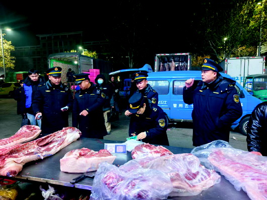 为强化辖区肉类经营市场监管,确保肉类产品质量安全,让市民吃上“放心肉”,12月25日凌晨,单县市场监管局对生鲜肉集中交易的刘海市场开展突击检查。