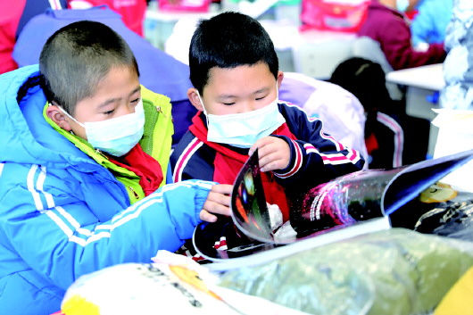 孩子们认真翻阅收到的新书。(烟台毓璜顶医院供图)