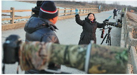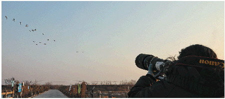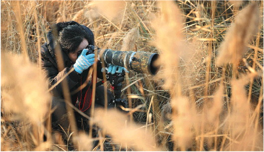 虽然套了两层羽绒服,脚穿厚皮靴,但不到半小时,王兴红已被冻透。为了便于拍摄,她只能戴两层薄手套,双手也冻得通红。随后,陆续有其他“鸟友”赶来,一见面就亲切地喊“飘雪老师”,并向她请教拍摄遇到的问题。王兴红在生态摄影圈小有名气,她的拍摄技巧常常被大伙学习,专业态度得到大伙的尊敬。
