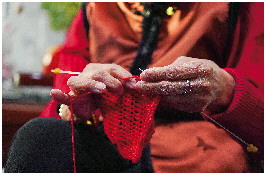 一团红毛线,两根毛衣针,这是彭奶奶织围巾的全部工具和物料;每天织半小时到一个小时,这是她一天中最快乐的时光。