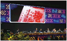 ▲在联合国教科文组织保护非物质文化遗产政府间委员会第19届常会评审现场,大屏幕在播放春节宣传视频。