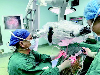 患者佘先生的父亲不幸罹患巨大听神经瘤,病情危重,严重的脑积水和意识不清使他在济南某医院治疗时只能依靠呼吸机维持生命。