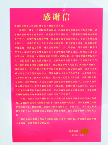 脑部巨大肿瘤、肿瘤脑干粘连严重、面神经被肿瘤挤压的像纸一样薄……面对已经处于深度昏迷且已经被上级医院放弃治疗的复杂重症患者,日照市人民医院神经外科一病区的医护团队用无畏的勇气和精湛的医术,将一位被上级医院“判了死刑”的重症患者从死亡边缘拉了回来。近日,日照市民佘先生将一封饱含深情的感谢信送到神经外科一病区,感谢他们让其父亲重获新生。