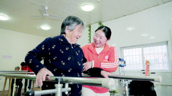 步入三楼的照护区,护理员们正在为失能和半失能老人做日常护理。“平常除了要给老人做基础的清洁护理,还要带他们去做复健。”护理员赵沭源介绍说,“冯大爷今年77岁,患有尿毒症,每周一、三、五都需要做肾透析。我们养老中心和康复医院之间开通了‘绿色通道’,我推着他,步行10分钟左右就能到达透析室。”