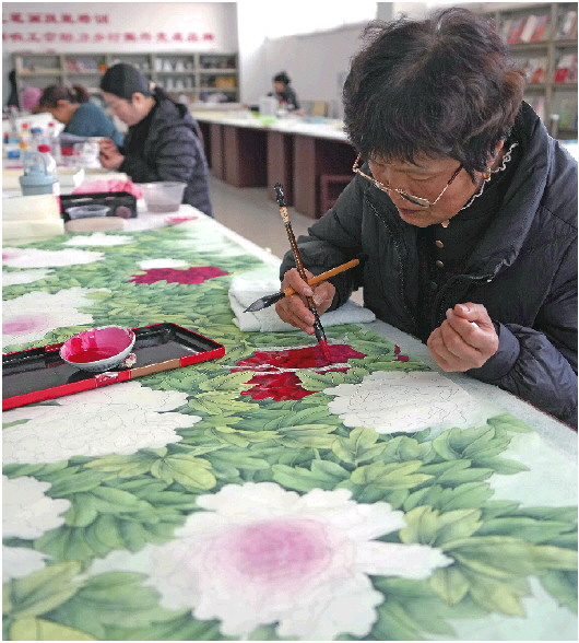 近日,山东省巨野县的工笔画绘画师忙着绘制以牡丹画为代表的工笔画作品,供应春节节前文化消费市场。近年来,山东省巨野县大力发展工笔画产业,全县有绘画专业镇4个、绘画专业村50个,书画产业从业人员2万余人,年创作工笔画作品超过100万件,作品远销40多个国家和地区。 新华社发