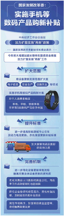国家发改委表示,今年将实施手机等数码产品购新补贴,对个人消费者购买手机、平板、智能手表手环等三类数码产品给予补贴。今年还将适当提高退休人员基本养老金和城乡居民基础养老金,提高城乡居民医保财政补助标准等。