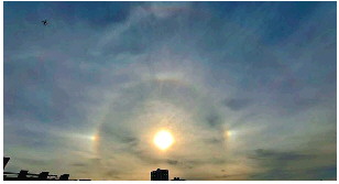 气象专家介绍,高空冰晶对太阳光折射所形成的样式,可以呈现出环状、弧状、柱状或亮点状,统称为大气晕族。