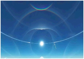 伴随着幻日出现的,常常还有环天顶弧。这种现象又称“倒挂彩虹”或“天空的微笑”,是指在靠近太阳一方的天空高处,出现一小段上蓝下红的彩色圆弧,它凸向太阳方向,圆心是天顶。