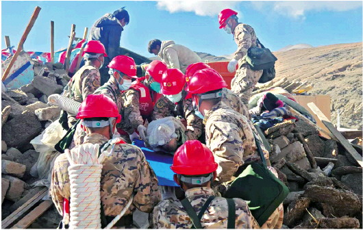 1月7日9时5分,日喀则市定日县发生6.8级地震,震中位于定日县措果乡,震中20公里范围内有3个乡(镇、街道)驻地、27个村,人口约6900人。经初步排查,截至19时,定日县地震已造成126人遇难、188人受伤。图为救援人员在定日县长所乡班久村进行搜救。 新华社发