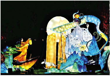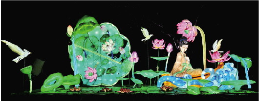 该花灯组展示的是一位仰面闭目的少女,锦鲤在水中翻腾跳跃,灯组底部翻腾不息的水花,营造出少女宛如浴水而出的梦幻场景。