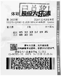 2024年12月28日,体彩大乐透第24151期开奖,当期全国中出5注一等奖,其中1注花落山东济南。济南购彩者的中奖彩票为一张6+3复式投注票,除中得一注一等奖外,还中得二等奖、四等奖、五等奖若干,单票收获奖金1031万元。