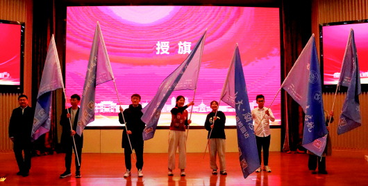 山东大学2025年寒假优秀学子母校回访活动启动仪式上,本科生院院长、本科招生办公室主任高瑞为学生授旗。