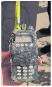当天,滨州市最低温度降至-15℃,由于长时间在低温环境下救援,灭火任务结束后,沾化经济开发区特勤消防救援站灭火救援四班班长李超身上穿戴的头盔、对讲机、战斗服等防护装备,都结满了厚厚的一层冰,战斗服更是变为了一件“冰铠甲”。