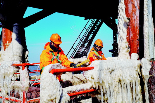 海洋采油厂迅速启动应急预案,坚守在海上安全生产一线的干部员工冒着严寒,使用消防斧等工具清理冰凌,为船舶带缆停靠和人员上下平台提供安全保障。