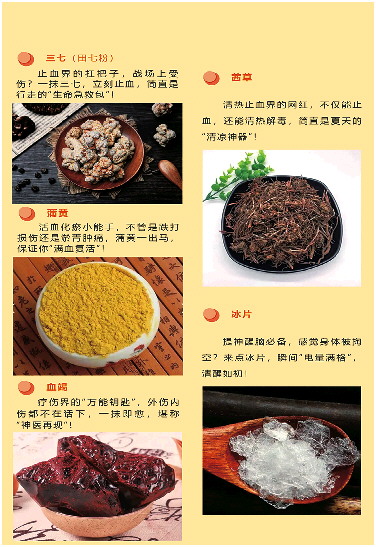 3、活血疗伤药:如马钱子、骨碎补、血竭等,常用于治疗骨折筋伤、血肿疼痛等症状;