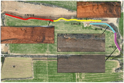 第三期城墙位于第一期城墙南侧,夯层厚4—5厘米,第四期城墙位于最南部,夯层厚8—18厘米。早、晚期城墙相隔约100米,随着城墙往东在陡岭下逐渐会合。