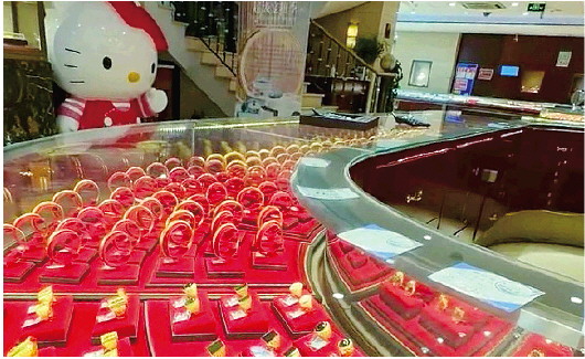 济南某金店摆放的多是黄金饰品,铂金饰品则很少。