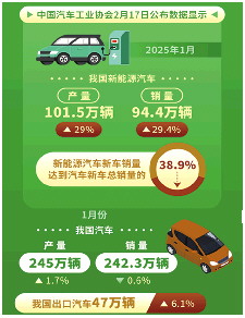 中国汽车工业协会2月17日公布数据显示,2025年1月,我国新能源汽车产销量分别达101.5万辆和94.4万辆,同比分别增长29%和29.4%,新能源汽车新车销量达到汽车新车总销量的38.9%。