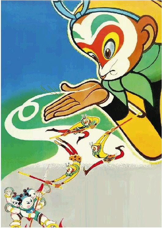 尤为值得一提的是,同样由万籁鸣导演的《大闹天宫》,由于当时没有电脑制作,仅绘制原画就花费了近两年时间,它不仅是我国第一部彩色动画电影,也被公认为是当时动画电影的巅峰之作,在国内外斩获诸多大奖。影片中的孙悟空造型明显以中国戏曲元素为主,以热烈大胆的红、黄、蓝、绿、白这五种单纯原色赋予孙悟空以鲜明的外形特征。从此,这一形象从《铁扇公主》中细胳膊细腿、动作僵化的小猴子,升级为顶天立地、无所不能的齐天大圣。