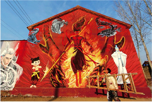 2月20日,淄博市周村区沈家村村民沈靖宇从其创作的哪吒主题墙绘前走过。