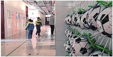越来越多的中小学校已将足球运动融入到了校园文化当中。图为沂源县悦庄镇赵庄小学教学楼走廊的文化墙上陈列着孩子们的足球。